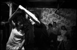 USA. Brooklyn, NY. 1957. Couple necking on pole at basement party...