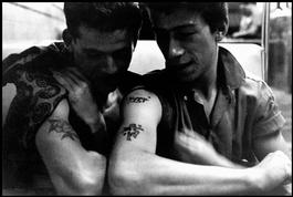 USA. New York City. 1959. Brooklyn Gang. Lefty showing his tattoo....