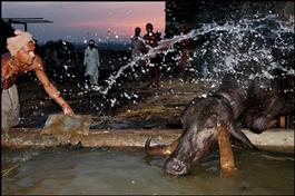 INDIA. Mumbai. Feeding buffaloes in Kurla at Bail Bazaar. Half...