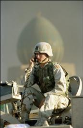 IRAQ. Baghdad. Next to the dome of a mosque, an American GI stands...