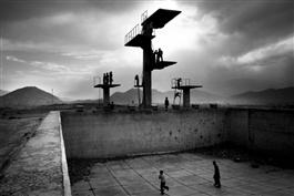 AFGHANISTAN. June 2006. Playing football in an empty swimming...