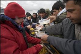 FRANCE, Calais. Immigrants eating daily midday meal provided...
