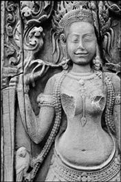 CAMBODIA. Angkor. Wounded devata ( sacred dancer) with a Mona...