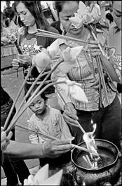 CAMBODIA. Phnom Penh. Buddhists offer prayers with incense and...