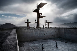 AFGHANISTAN. June 2006. Playing football in an empty swimming...