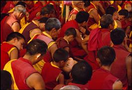 TIBET. A young Tulku, blesses a western monk by touching foreheads,...