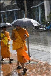 LAOS. Luang Prabang. Buddhist novices with umbrella on a rainy...