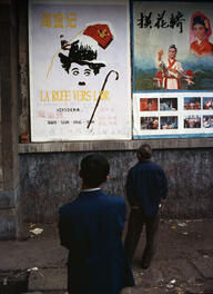 Chengdu. Cinema billboards including Charlie Chaplin.