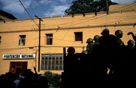 HAITI. Port-au-Prince. 1986. Soldiers arriving to quell prison...