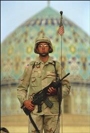 IRAQ. Baghdad. An American GI stands guard in front of a mosque....