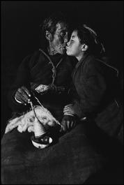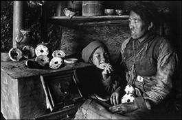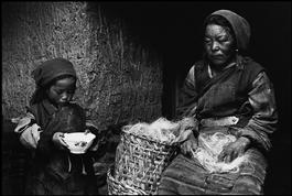 TIBET. Xigaze. 2000. Mother dividing up milk to two daughters....