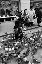 FRANCE. Paris. Woman feeding pigeons on the Champs Elysees avenue....