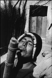 BOLIVIA. Tarabuco. Indian playing the Tocoro, typical instrument...