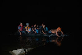 USA. ROMA, TX. Migrants arrive on shore after crossing a narrow...