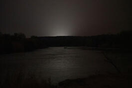 USA. ROMA, TX. A deflated raft on shore at a narrow stretch of...
