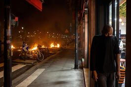 France. Paris. 2023. Fires set by protestors near Place de la...