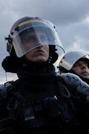 France. Paris. 2023. Police and protestor at Place de la Republique....