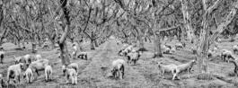 USA. Farmersville, California. 2022. Sheep in a walnut orchard....