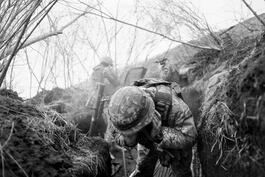 UKRAINE. March 11, 2023. A soldier with a Ukrainian mortar team...
