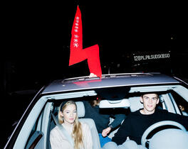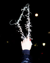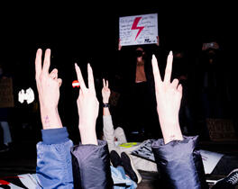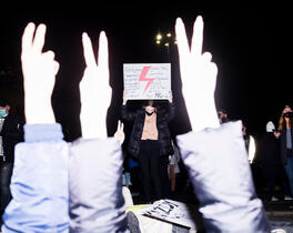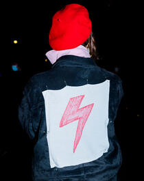 Protester with red bolt a...