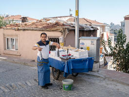 TURKEY. Istanbul. 2022. Fisherman sells fish on the streets of...