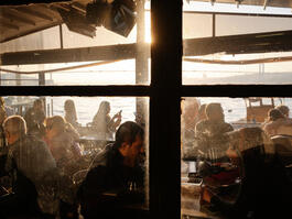 TURKEY. Istanbul. 2022. Teenagers stand near the sea as they...