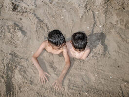 TURKEY., Istanbul. 2022. Children play in the sand on the beach....