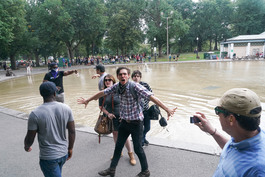 USA. Boston, Massachusetts. 2017. Pedestrians watch clashes...