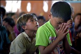 Cambodia. Chong Khnies. Tonle Sap Lake. A little boy prays...