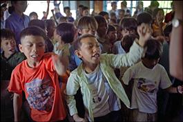 Cambodia. Chong Khnies. Tonle Sap Lake. Children sing and pray...
