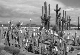 USA. ARIZONA. Winter cactus garden. Paper cups to protect against...