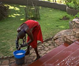 KENYA. Maasai Mara. Serena Mara hotel. Maasai porter mopping...