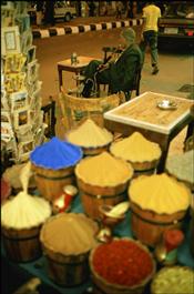 EGYPT. Aswan. A spice shop in the bazaar with the owner smoking...