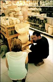 EGYPT. Thebes. Tourists examine raw stones for carving into artefacts...