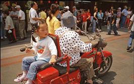 CHINA. Shanghai. Child with lollipop takes a ride on the back...