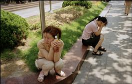 CHINA. Shanghai. Two ladies take a kerbside rest in central...