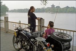 China. Beijing. Motorcyclist with his lady, motorcycle and...
