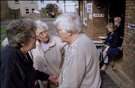 England. Iver. Women discuss politics outside polling booth...