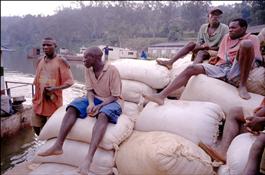 Africa. Rwanda. Cyangugu. Workers waiting to load sacks on...