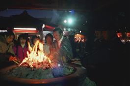 JAPAN. Fuji City. Shrine, people breathe insense for good fortune....