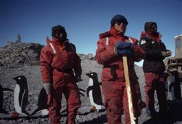 ANTARCTICA. Greenpeace bring plywood penguins ashore for a demonstration...