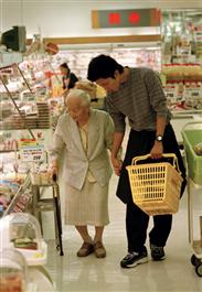 JAPAN. Nara City. Okinawa Island. 100 year old Mrs Fumi shopping...
