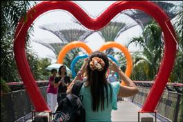 Singapore. A tourist photographs her friends under the heart-shaped...