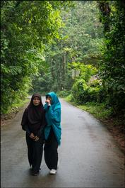 Singapore. Two veiled Muslim women walk among the forestry of...