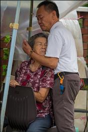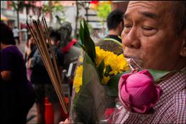 Singapore. A Chinese gentleman brings flowers and incense offerings...