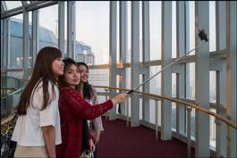 Singapore. Three visitors to ION Sky, two viewing terraces on...