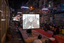 MYANMAR. 2014. YANGON. Preparing or a Buddhist monk to lecture...