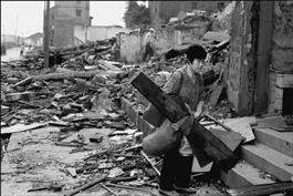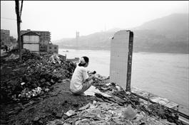 Asia. China. Sichuan. Wanxian. A family sits amongst the ruins...