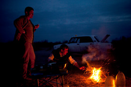 TURKMENISTAN. Darvaza. 2009. A Russian tour guide barbecues chicken...