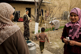 KYRGYZSTAN. Karasu. 2008. Uzbek women gather by a garden in front...